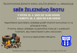 Tělovýchovná jednota Sokol Golčův Jeníkov, z.s. organizuje v pátek dne 25.4.2025 od 16:00 hod. a v sobotu dne 26.4.2025 od 8:00 sběr starého železného šrotu.