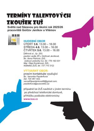 V příloze naleznete termíny talentových zkoušek ZUŠ Světlá nad Sázavou, pracoviště Golčův Jeníkov a Vilémov pro školní rok 2025/2026.