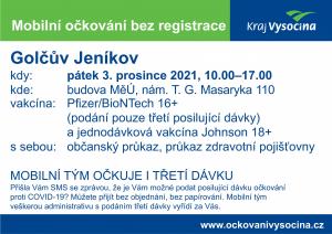 V pátek 3. prosince je možné v Golčově Jeníkově, v budově Městského úřadu, nám. T. G. Masaryka 110, absolvovat očkování bez registrace.