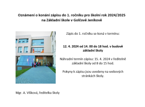 Oznámení o konání zápisu do 1. ročníku pro školní rok 2024/2025 na Základní škole v Golčově Jeníkově