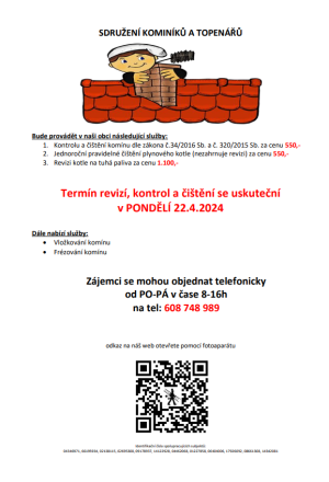 Bude provádět v naší obci v PONDĚLÍ dne 22.4. požadované kontroly a čištění komínů dle zákonu č. 34/2016 Sb., čištění plynových kotlů a revize kotlů na tuhá paliva. Dále nabízí vložkování a frézování komínů.