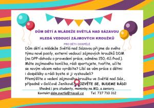 DDM SVĚTLÁ NAD SÁZAVOU HLEDÁ VEDOUCÍ ZÁJMOVÝCH KROUŽKŮ