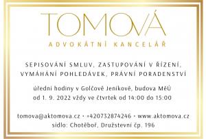 Úřední hodiny Advokátní kanceláře Tomová - od 1.9.2022 vždy ve čtvrtek od 14.00 do 15.00 hod. v budově MěÚ Golčův Jeníkov.