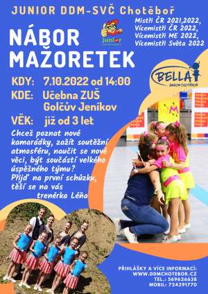 Junior DDM - SVČ Chotěboř pořádá dne 7.10.2022 od 14.00 hod. v učebně ZUŠ Golčův Jeníkov nábor mažoretek.
