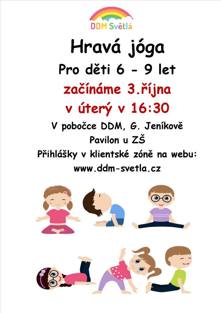 DDM Světlá nad Sázavou nabízí pro děti od 6 do 9 let "hravou jógu." Cvičení bude probíhat v pavilonu u ZŠ Golčův Jeníkov od 3.10.2023, vždy v úterý od 16.30 hod.