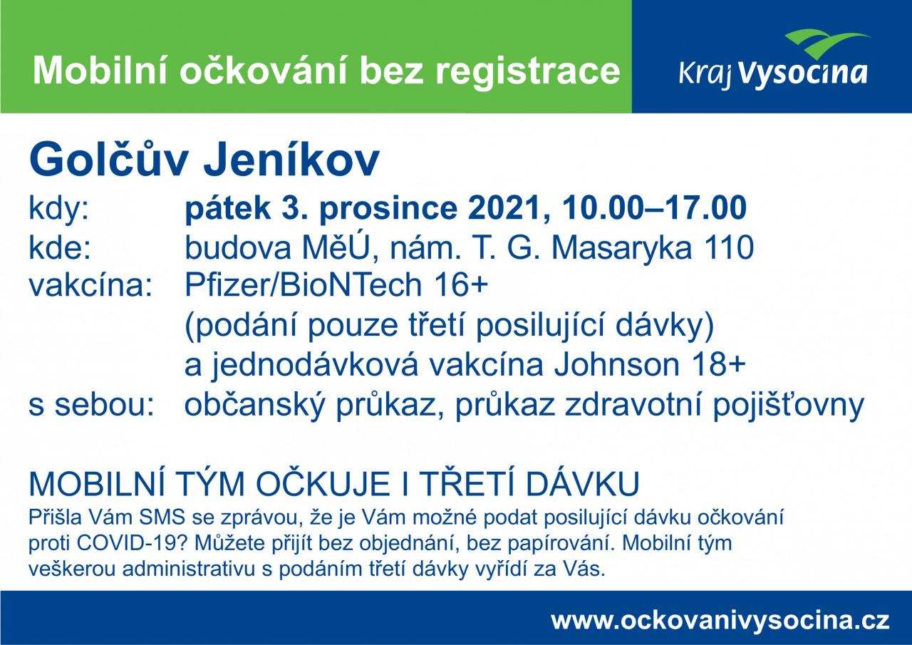 V pátek 3. prosince je možné v Golčově Jeníkově, v budově Městského úřadu, nám. T. G. Masaryka 110, absolvovat očkování bez registrace. Očkovat se bude od 10 do 17 hodin jednodávkovou vakcínou Johnson & Johnson pro osoby starší 18 let. Podány budou i třetí posilující dávky vakcíny Pfizer/BioNTech. Nezapomeňte si s sebou vzít občanský průkaz a průkaz zdravotní pojišťovny. Více informací na www.ockovanivysocina.cz. Stačí jen přijít, veškerou administrativu zařídí pracovníci mobilního očkovacího týmu. Očkování bez registrace bude probíhat v pátek 3. prosince od 10 do 17 hodin v Golčově Jeníkově.