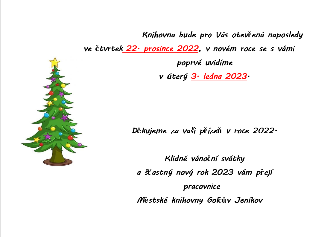 Informujeme občany, že městská knihovna bude v době od 23.12.2022 do 2.1.2023 zavřená.