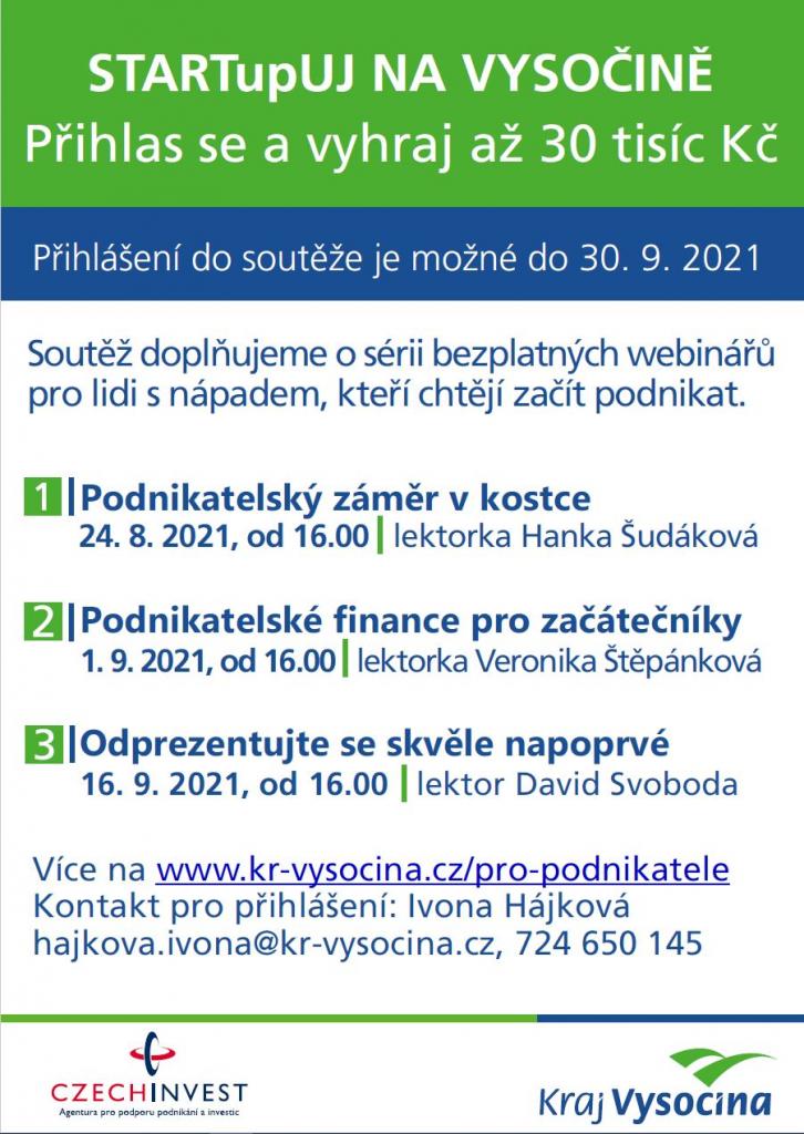 Webináře - soutěž STARTupUJ NA VYSOČINĚ, kterou CzechInvest ve spolupráci s Krajem Vysočina a dalšími partnery připravil pro začínající podnikatele na Vysočině.