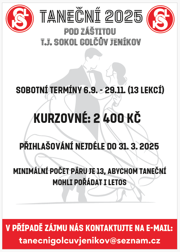 T.J. Sokol Golčův Jeníkov připravuje taneční kurz od 6. září do 29. listopadu 2025. Kurzovné činí 2400 Kč a přihlášky je nutné podat nejpozději do 31. března. Aby se kurz mohl uskutečnit, je potřeba minimálně 13 párů. V případě zájmu kontaktujte organizátory na e-mail.