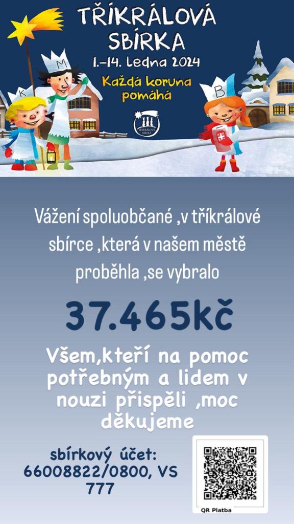 V tříkrálové sbírce se vybralo 37 465 Kč. Děkujeme všem, kteří na pomoc potřebným a lidem v nouzi přispěli.