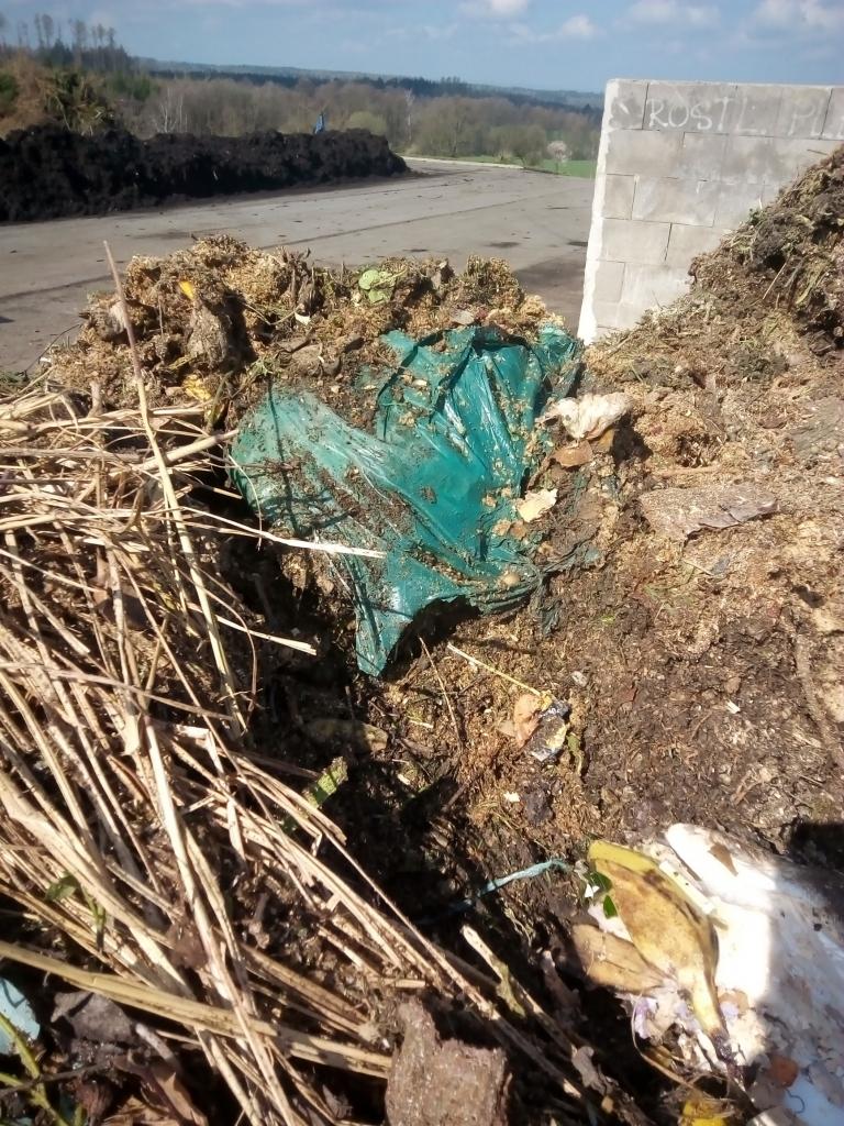 Po prvním svozu bioodpadu 10.4.2023 se z útrob svozového vozu na kompostárně vyvalila směs zeleně a plastů všeho druhu.