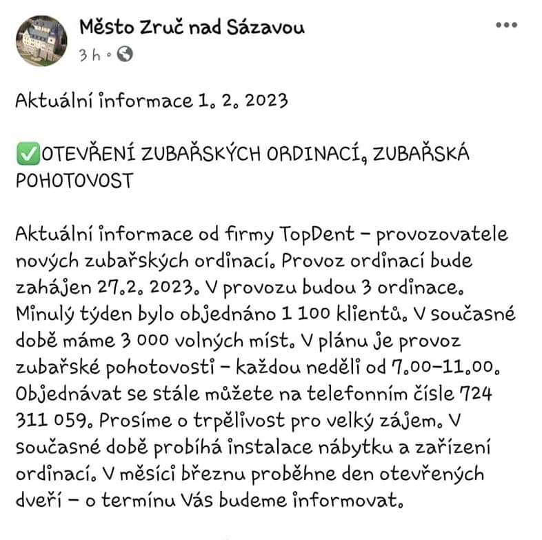 Dne 27.2.2023 byl zahájen provoz nových zubařských ordinací ve Zruči nad Sázavou.